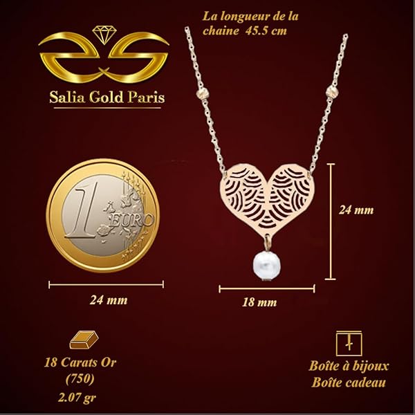 Collier cœur or jaune 18 carats femme – Pendentif motif vague et perle suspendue 2/07 gr Or sans perle– Cadeau romantique raffiné – Salia Gold Paris€426
