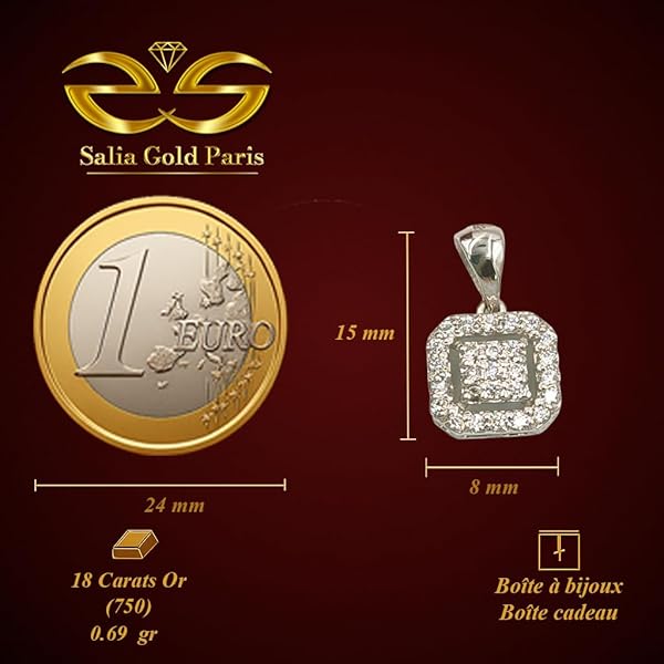 Pendentif or blanc 18 carats 0.69g Or 750/1000 – Design carré avec pavage de pierres blanches scintillantes – Salia Gold Paris€152